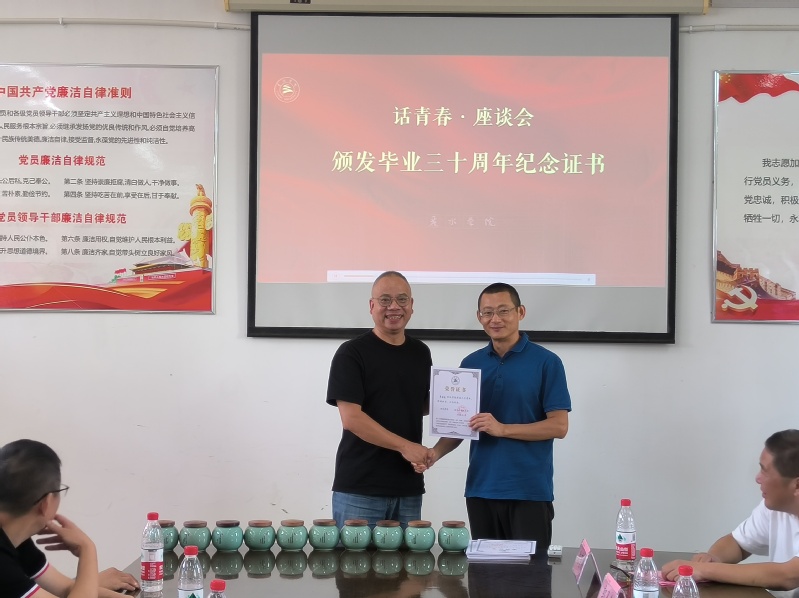 座谈会上,生化90班老教师叶选怡、沈育刚、王永江等教师陆续发言,共同回忆了往昔的欢乐时光。最后,校友们畅叙抒怀,不仅对母校的培养表达了深切的感激之情,还对学校如今的发展表示欣慰与关切,并针对学校未来发展和具体情况提出宝贵建议。座谈会结束之际,彭兵为生化90班颁发毕业三十周年纪念证书,同各位校友合影留念。会后,校友们参观了校史馆及中医药产业大楼,共同见证学校的发展历程,望尽来时路;了解学校的创新科研成果,共盼未来时。