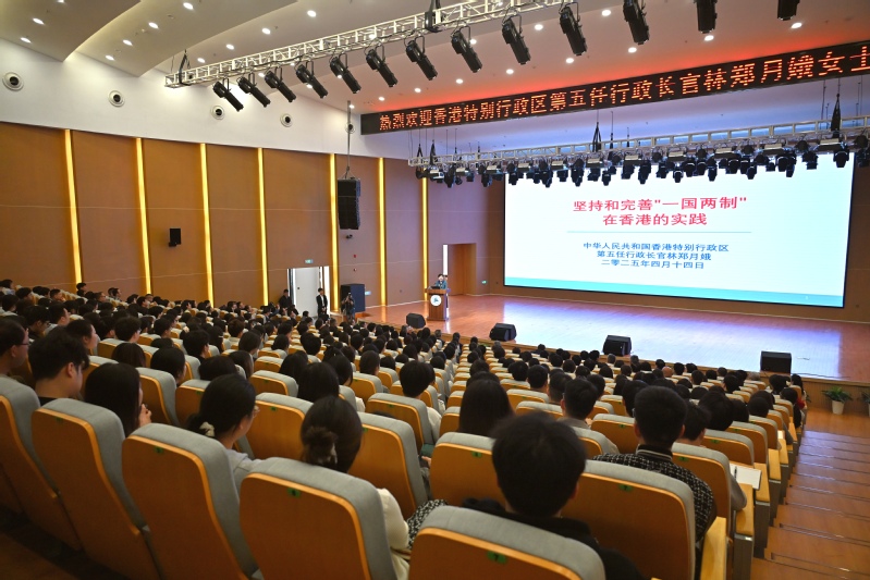 林郑月娥女士以《坚持和完善“一国两制”在香港的实践》为题,从“一国两制”的历史脉络、香港宪制秩序、行政长官职责、实践新阶段等维度展开阐述,以亲身经历与深刻洞察,深度剖析“坚持和完善‘一国两制’在香港的实践”,为师生讲解方针背后鲜为人知却意义深远的故事。她表示,在党中央的指导和支持下,香港特区遵循《中华人民共和国宪法》和《中华人民共和国香港特别行政区基本法》的规定,实现了由乱到治的重大转折,并将踏上由治及兴的新征程。她强调,“一国两制”为香港发展提供了坚定信心,香港百年的历史和发展历程证明“一国两制”符合国家、民族利益、香港利益。香港特区必须全面准确贯彻“一国两制”,准确把握“一国”与“两制”的重大原则,坚决落实“爱国者治港”,确保“一国两制”行稳致远。新时代需要把握好四条“一国两制”实践的重大原则,一是要坚守“一国”之本、善用“两制”之利;二是要维护高水平安全、推动高质量发展;三是要发挥独特优势、强化内联外通;四是要弘扬核心价值、促进包容和谐。