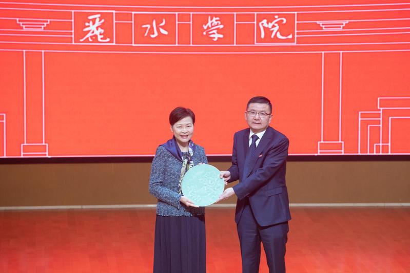 李俊杰对林郑月娥女士一行的到访表示热烈的欢迎和诚挚的感谢。他表示,今天的演讲与交流让师生们对“一国两制”方针的核心要义有了更加深刻地领会和把握,更为丽水师生与香港交流搭建了桥梁。一直以来,学校积极拓展与香港高校及相关机构的交流与合作,开展师生交流,取得较好成果。2024年,我校成功获批港澳台地区本科学生招生资格,首批招收6名香港学生。未来,学校将进一步加强与香港开展多层次、宽领域的交流与合作,尤其是与香港高校在学科建设、人才培养、学术交流、科技创新和青年学子交流交往交融上的合作,为加快推动丽港高水平合作和高质量发展贡献丽院力量。
