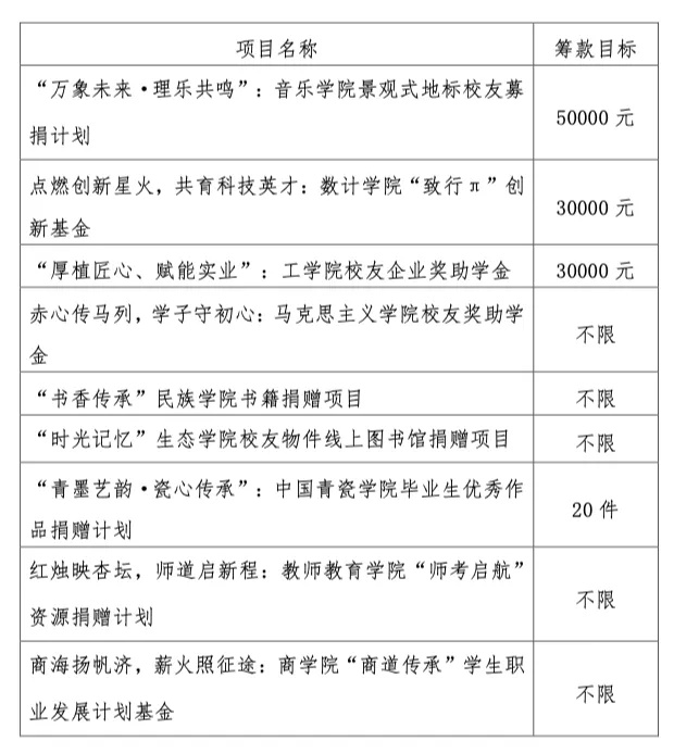 为进一步汇聚校友力量,共筑母校未来,丽水学院校友总会推出系列社会捐赠项目,诚邀您为学院建设添砖加瓦。您的每一笔捐赠,都将由丽水学院教育基金会统一管理,用于人才培养、教师发展、科研创新、校园建设等关键领域,助力学弟学妹成长成才,赋能母校高质量发展。