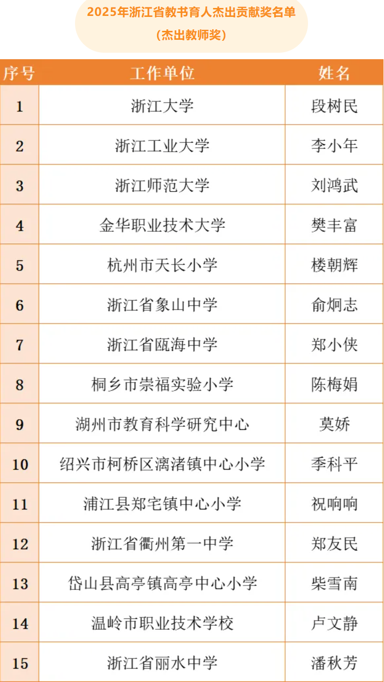 2025年浙江省教书育人杰出贡献奖包括省教学成果奖和省杰出教师奖两个项目,其中浙江省杰出教师评选旨在表彰在教育事业中作出杰出贡献的教师,评选条件包括政治素质、教育理念、教学成果、学术贡献等多方面要求;评选范围主要面向获得全国优秀教师、全国优秀教育工作者及以上称号的在职教师,或在浙“两院“院士。浙江省杰出教师一般每3年评选一次 ,每次表彰名额不超过15名。