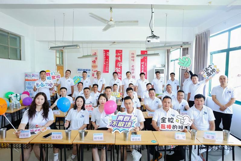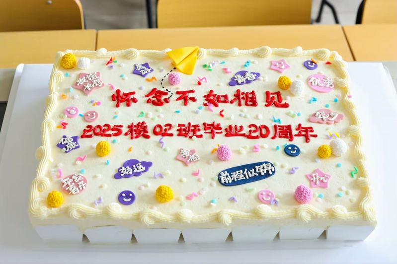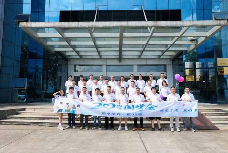 8 月 23 日,丽水学院工学院模具 02 级 39 名校友跨越多年时光返校,共赴一场温馨的同学会,重温青春岁月。校友们首先来到曾经上学时的教室:黑板上“模具 02 级,我们回家了” 的标语格外暖心,课桌上摆放着当年的座位表与纪念徽章。大家迅速找到自己曾经的座位坐下,一边翻看老照片、聊近况,一边追忆求学时的趣事,不时用手机定格重逢瞬间。现场还开展了简短的 “青春回忆” 互动,校友们模仿当年上课场景,氛围热闹又怀旧。活动尾声,印有 “模具 02 级毕业20周年” 字样的定制蛋糕登场,众人共同切开,将温馨感推向高潮。