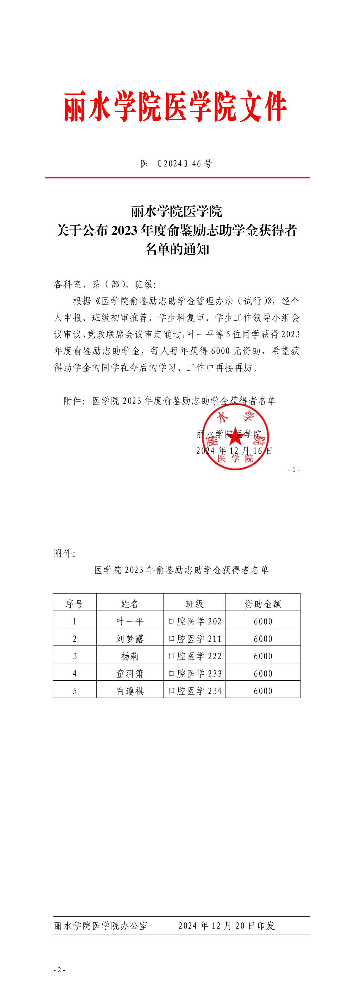 医(2024)46号丽水学院医学院关于公布2023年度俞鉴励志助学金获得者名单的通知