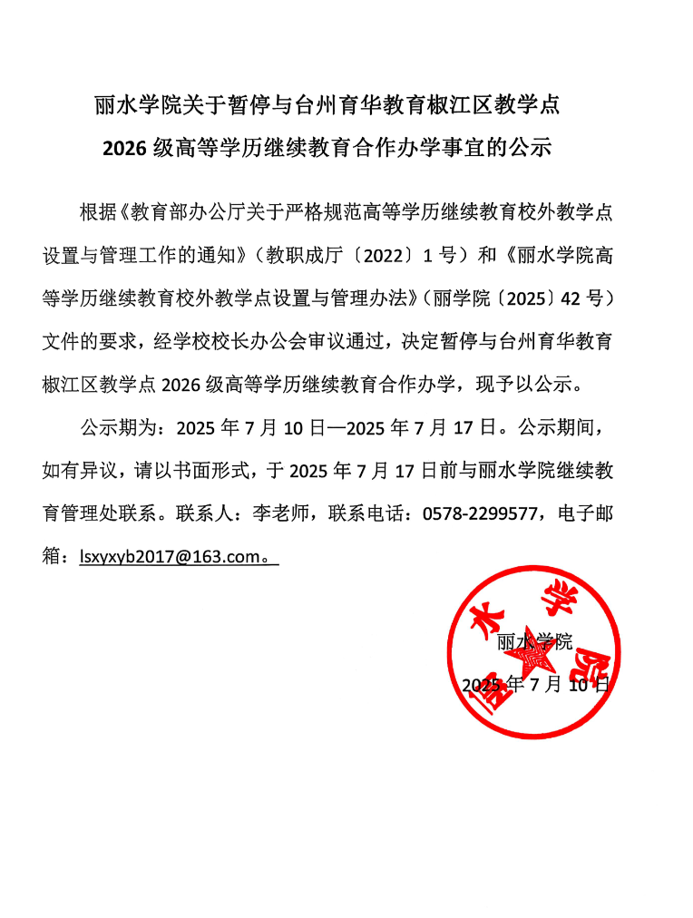 丽水学院关于暂停与台州育华教育椒江区教学点2026级高等学历继续教育合作办学事宜的公示