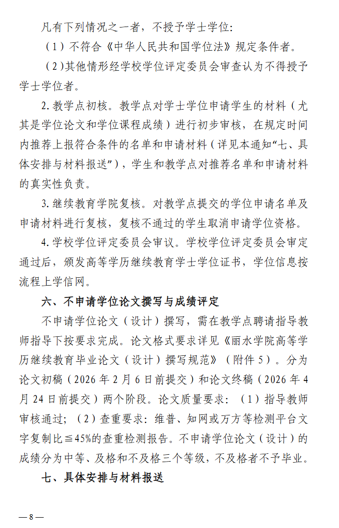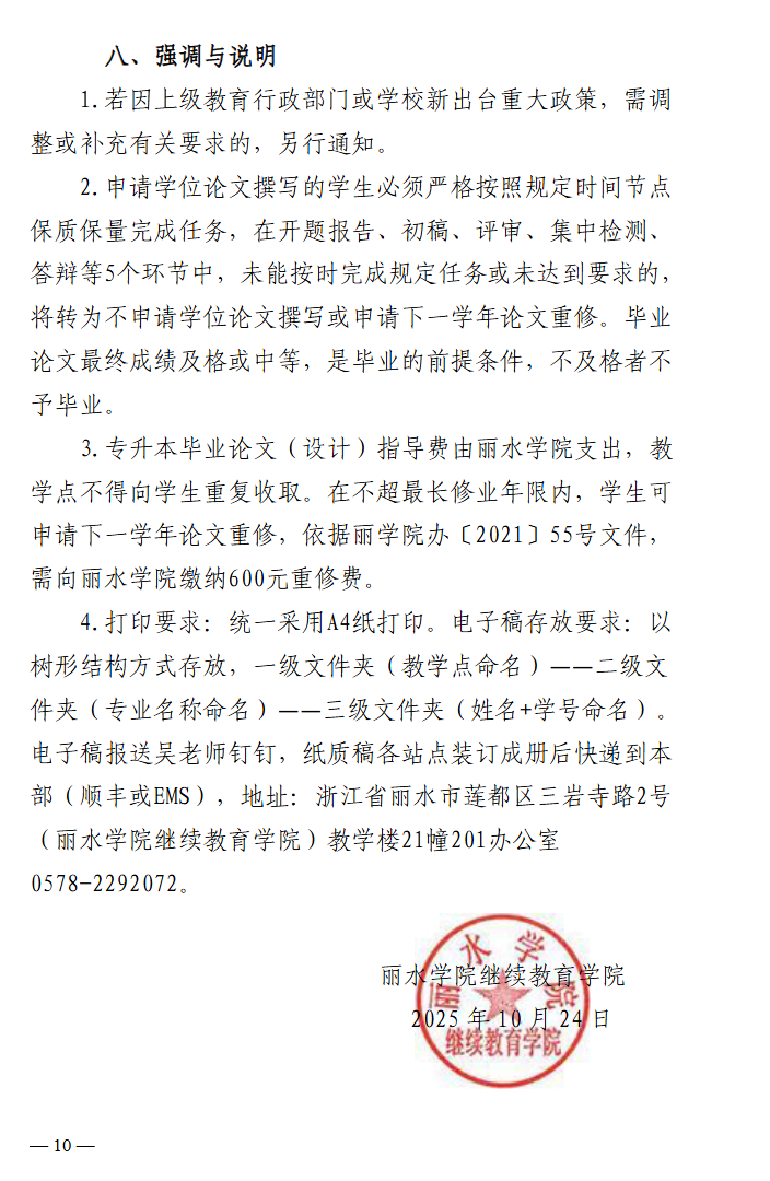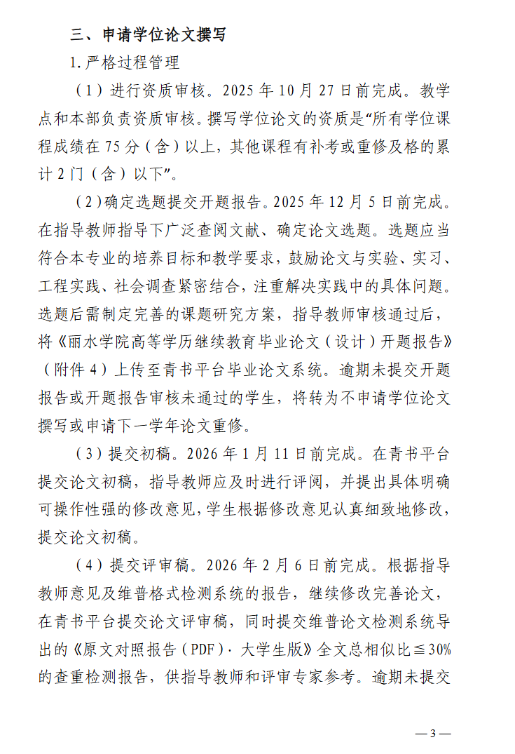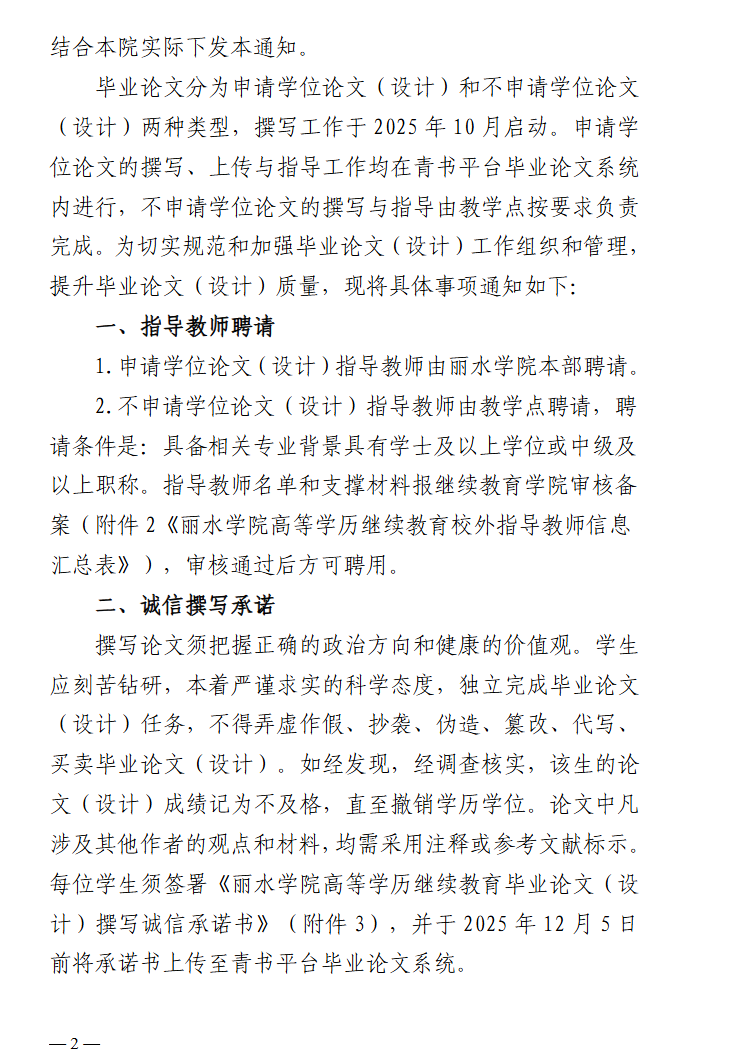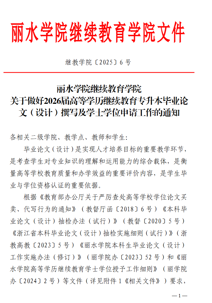 继教学院〔2025〕6号丽水学院继续教育学院 关于做好2026届高等学历继续教育专升本毕业论文(设计)撰写及学士学位申请工作的通知